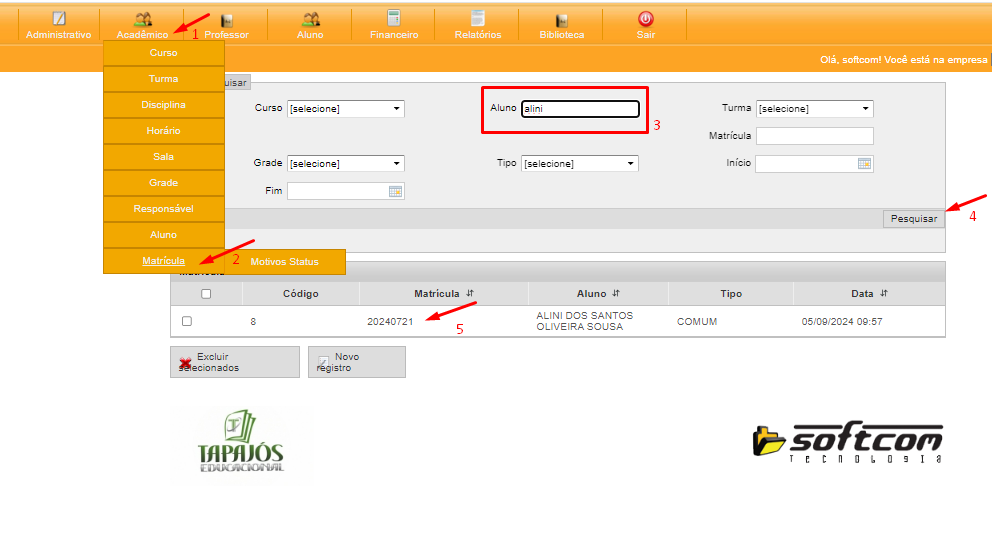OU CASO JÁ EXISTA A MATRICULA > 3- PESQUISAR NOME ou MATRICULA > 4- PESQUISAR CLICAR NO BOTÃO > 5- CLICAR NO RESULTADO ABAIXO.
