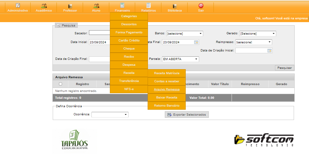 A. PARA GERAR A REMESSA: FINANCEIRO > RECEITA > ARQUIVO REMESSA;