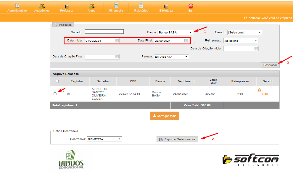 D. SELECIONAR A OCORRÊNCIA "REMESSA" E 5- EXPORTAR SELECIONADOS;