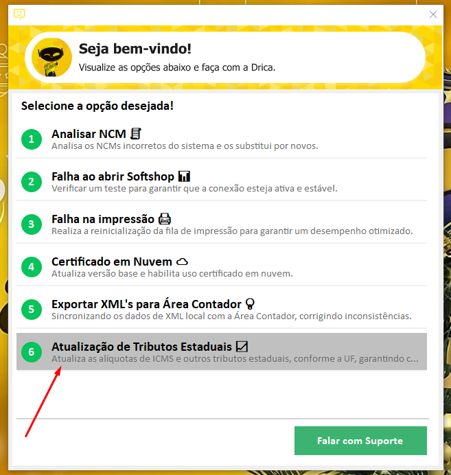Em seguida selecionar a opção 6 - Atualização de Tributos Estaduais e aguardar a finalização.