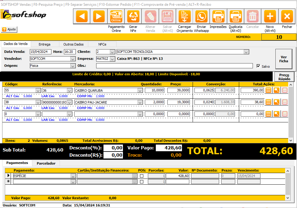 6º Passo: Na venda Os produtos vendidos terão as quantidade lançadas em unidades e o sistema irá converter para M³, a emissão do pedido será em unidade e o preço também em unidade, mais para a emissão de NFCe e NFe será sempre em M³ (Cumprindo a nova legislação do DOF+);