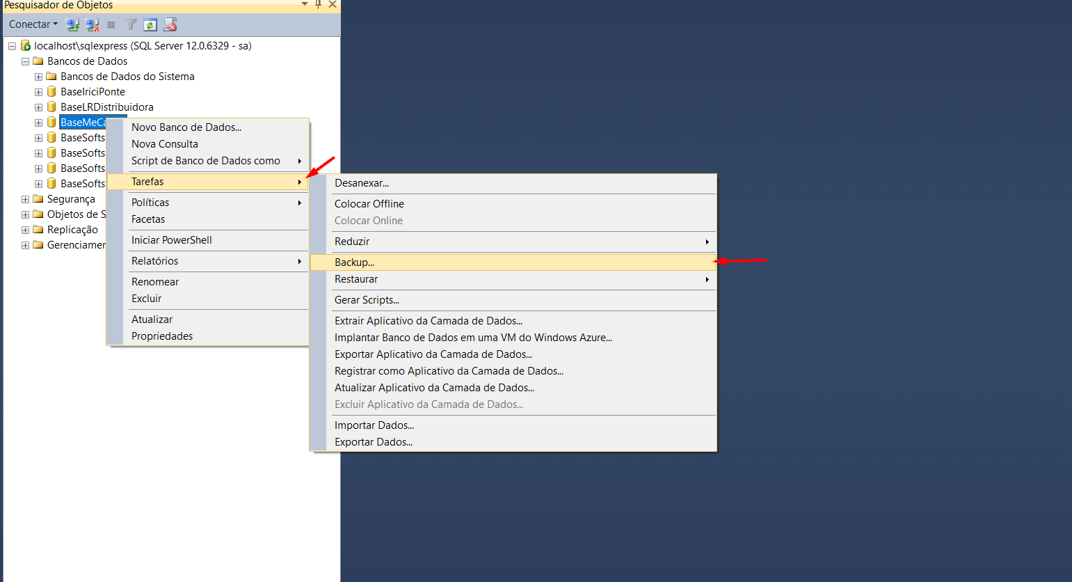 3-Com o botão direito no banco desejado, e em Tarefas selecionar a opção Backup