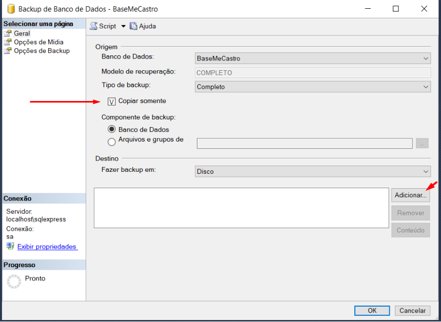 É obrigatório marcar a opção "Copiar somentebackup" nas versões mais antigas do SQL pode estar como "Copiar somente" , principalmente quando o cliente utiliza backup cloud. Caso essa opção não sejamarcada, há o risco de comprometimento das informações enviadas para o backupcloud, podendo resultar na perda de dados.
