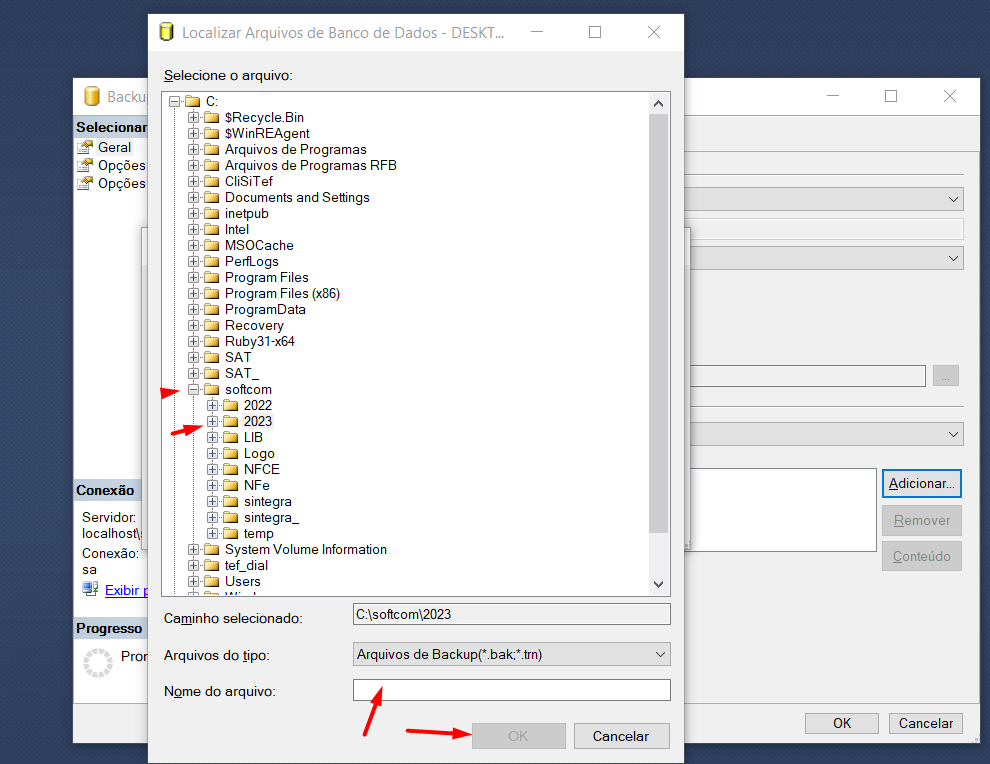 6-Em seguida, selecionar a pasta de que seja que o arquivo seja salvo, informar o nome do arquivo como backup.bak e clicar em OK