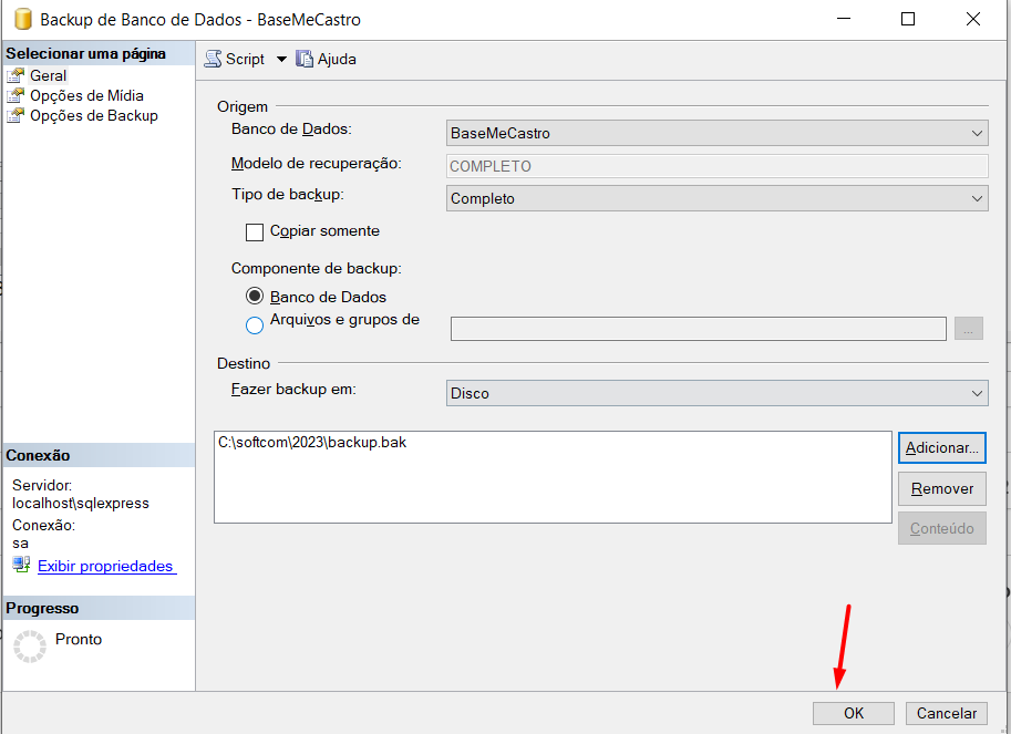 8-E na tela de backup do banco de dados clicar em Ok e aguardar a mensagem de finalização o backup