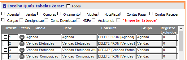 6 - Escolha quais tabelas Zerar (as tabelas marcadas serão zeradas):
