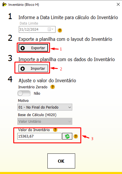 Seguindo os passos da tela é possível Exportar arquivo Excel para o cliente preencher os dados (Passo 1), devolver para Importar no sistema (Passo 2), Conferir Valores (Passo 3). Após isso o SPED já pode ser gerado e o Inventário vai conter os valores que foram importados.