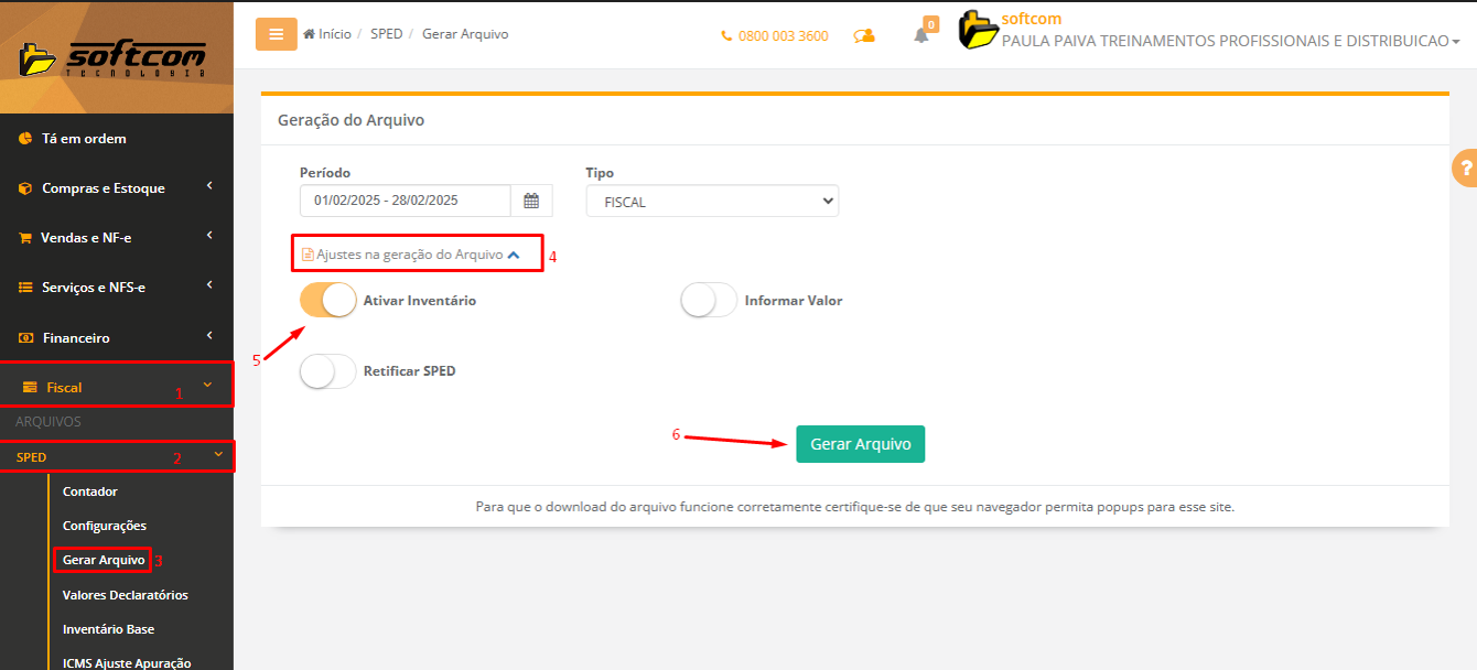 Seguindo o passo a passo, será possivel gerar o sped com inventário pelo softcomshop