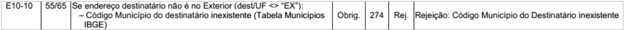 Quando for emitida uma NF-e para destinatário localizado no Brasil (UF diferente de "EX - Exterior") e o Código do Município do Destinatário não existir na Tabela de Municípios do IBGE, será retornado a rejeição "274 - Código Município do Destinatário inexistente".