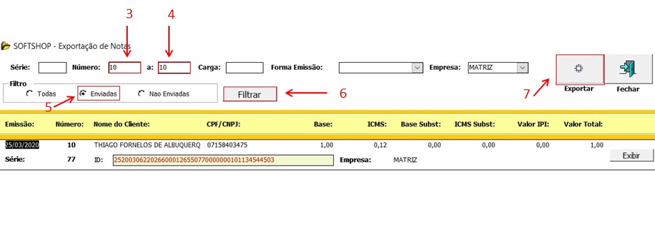 3 - Ao abrir tela escolha a nota que deseja recuperar o xml (3), (4) marque enviadas (5) filtre (6) e exporte (7).