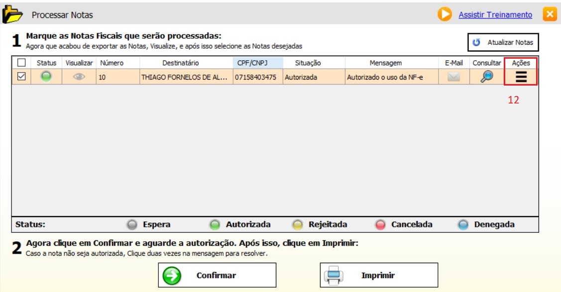 7 - Irá abrir a tela abaixo, confira os dados da nota que será recuperado o XML e clique em ações (12):
