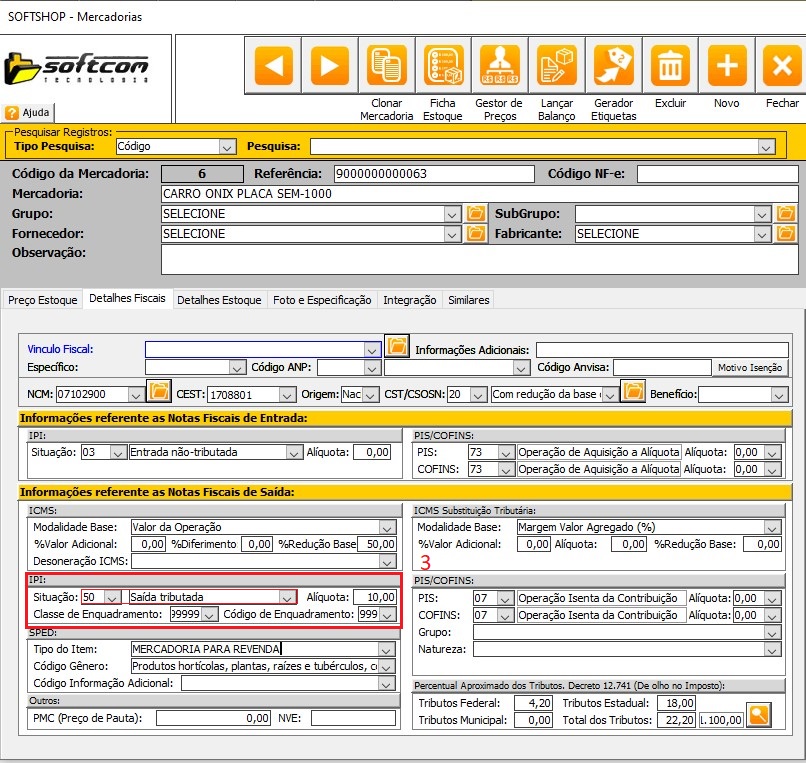 1 - Acesse o cadastro de mercadoria (1), aba Detalhes Fiscais (2).