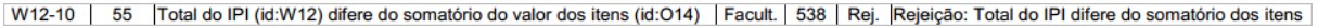 Quando for emitida uma NF-e com o Total do IPI da NF-e (Campo: total / ICMSTot / vIPI - ID: W12) diferente do somatório do valor do IPI (ID: O14) de cada item, será retornado a rejeição "538 - Total do IPI difere do somatório dos itens".