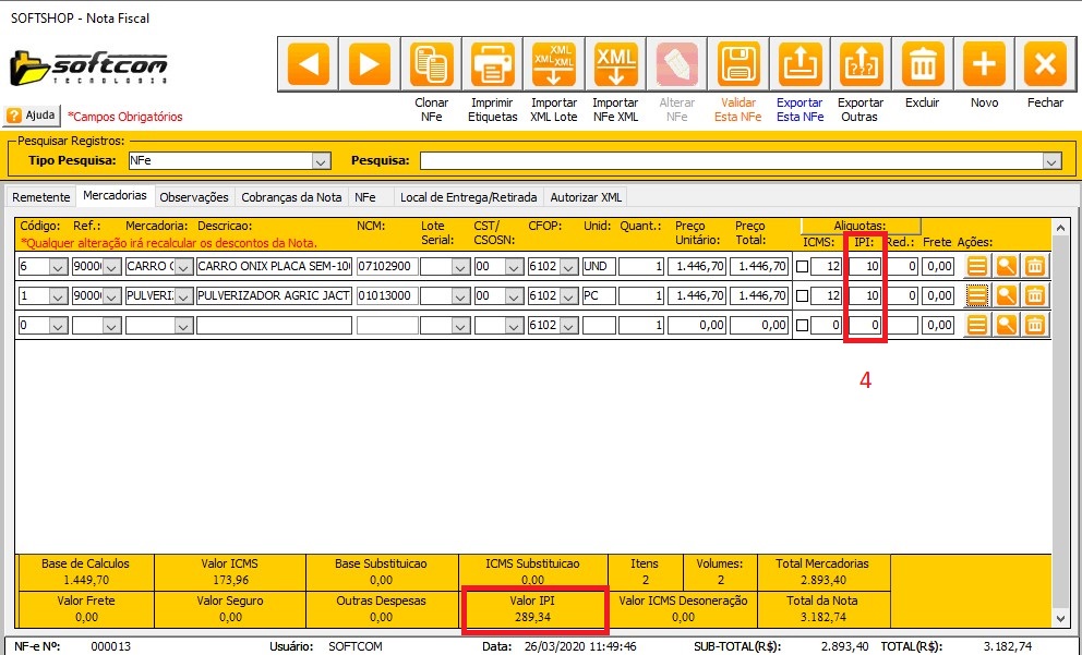3 - Verifique se na nota fiscal aba mercadorias, as mercadorias estão com suas alíquotas de IPI (4).
