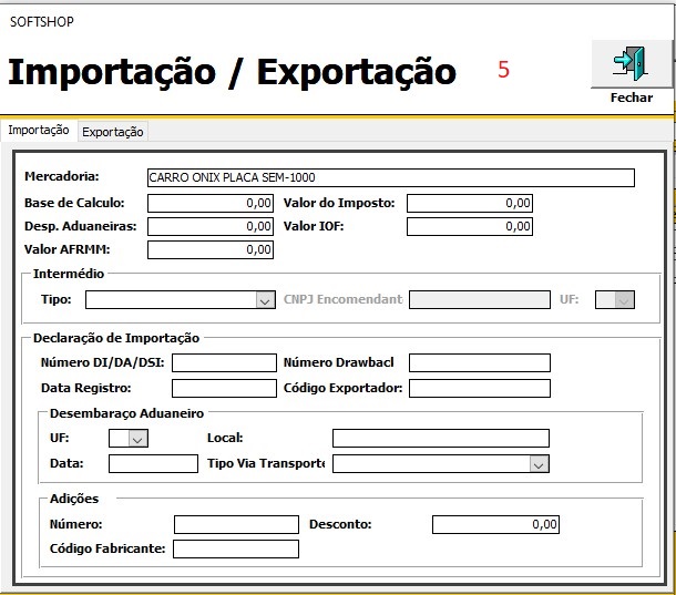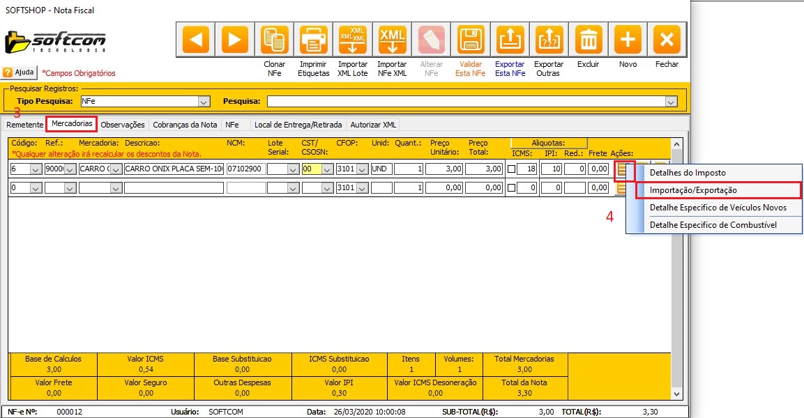 2 - No Softshop, na tela de nota fiscal, aba mercadorias (3), va em ações Importação / Exportação (4). ao abrir a tela (5) preencha as informações , feche valide a nota e exporte.