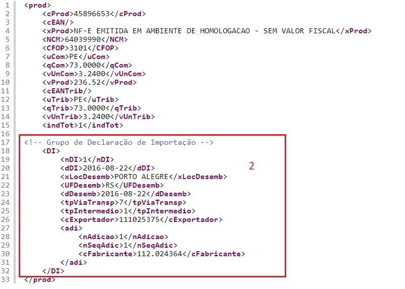Deve-se informar o Grupo de Declaração de Importação para corrigir essa rejeição. Veja a seguir o exemplo corrigido (2):