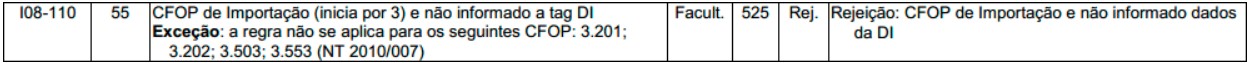 Quando for emitida uma NF-e com CFOP iniciado por 3, indicando uma Operação com o Exterior (idDest = 3) e de Entrada (tpNF = 0), e não for informado o Grupo de Declaração de Importação (DI), será retornado a rejeição "525 - CFOP de Importação e não informado dados da DI".
