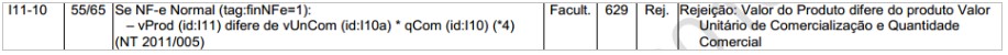 Quando for emitida uma NF-e (modelo 55) ou NFC-e (modelo 65) com Finalidade (Campo: ide / finNFe - ID: B25) igual à " 1 - Normal", com erro (superior a R$ 0,01) no Valor do Produto (Campo: det / prod / vProd - ID: I11) oriundo da multiplicação (produto) entre o Valor Unitário de Comercialização (Campo: det / prod / vUnCom- ID: I10a) e a Quantidade Comercial (Campo: det / prod / qCom- ID: I10), será retornado a rejeição "629 - Valor do Produto difere do produto Valor Unitário de Comercialização e Quantidade Comercial" .