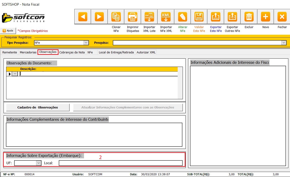 3 - .Na aba Observação, em Informação Sobre Exportação ( Embarque ) - Colocar a UF e o Local de Embarque ( local pode ser a cidade ) Exportar as informações e processá-la no Emissor de Notas.
