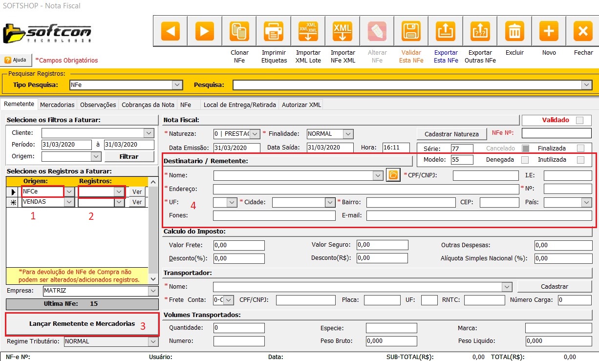 1 - Na Tela de notas fiscais na origem (1) colocar o tipo NFCe e no campo Registros (2) colocar o numero da NFCe. Lançar Remetente e Mercadorias (3), Caso o cliente não tenha sido identificado no cupom selecionar o destinatario (4).