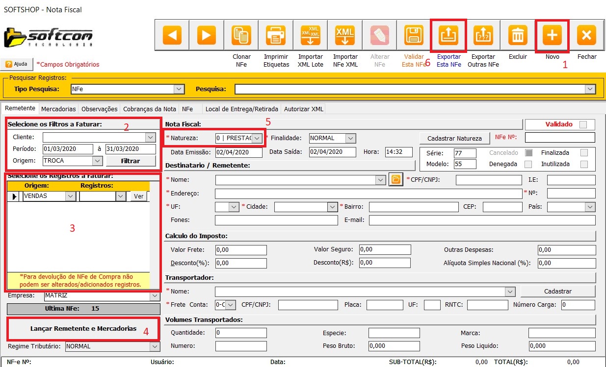 2 - Ao abrir a tela de notas siga a sequencia (1), para iniciar uma nova nota. (2), informe o periodo das trocas, escolha o origem TROCA e clique em filtrar. (3) aqui serão listadas todas as trocas do período, clique em lançar remetente e mercadorias (4), preencha o CFOP (5), 1202 e valide e exporte a NF-e (6).