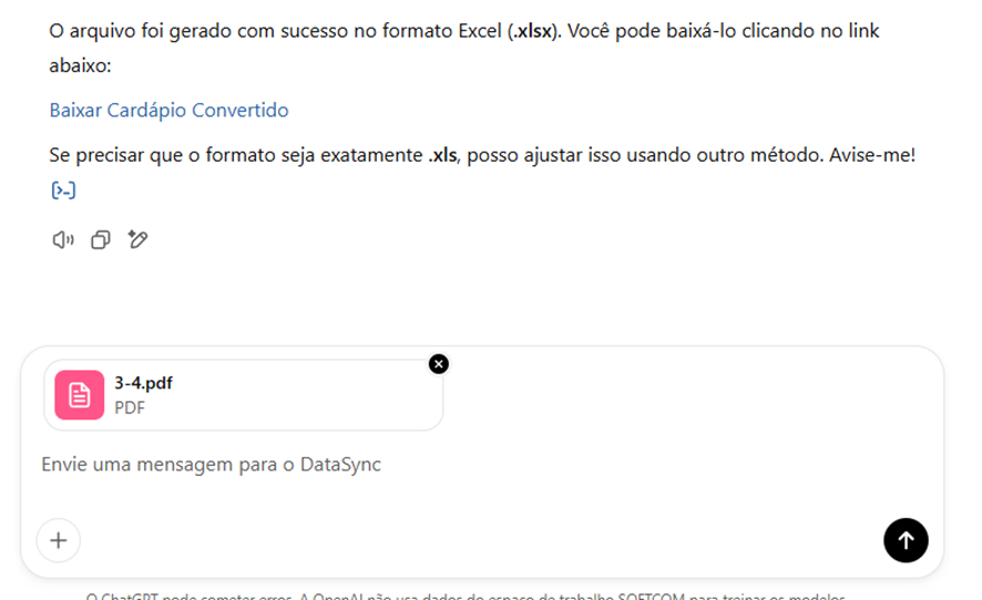 Sempre que for necessário cadastrar cardápios no sistema, o usuário pode enviar o arquivo para conversão. O DataSync extrai e processa os dados, gerando uma planilha pronta para uso. Em seguida, é possível utilizar a ferramenta Importador de Terceiros para importar os dados diretamente no sistema Softshop , de maneira prática e eficiente.
