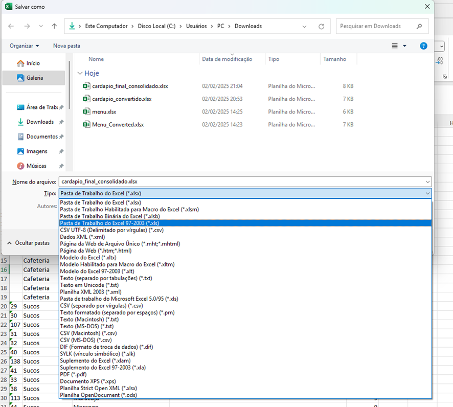 - B. No campo "Tipo" , selecione a opção "Pasta de Trabalho do Excel 97-2003 (*.xls)".
