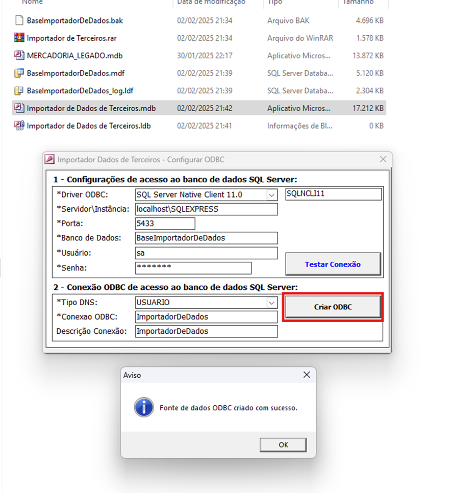 - Na janela de configuração de conexão do Importador, clique em "Criar ODBC" e aguarde até que a mensagem de confirmação da criação da fonte de dados seja exibida. Em seguida, feche a janela de Conexão e aguarde o início do Importador.