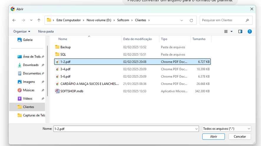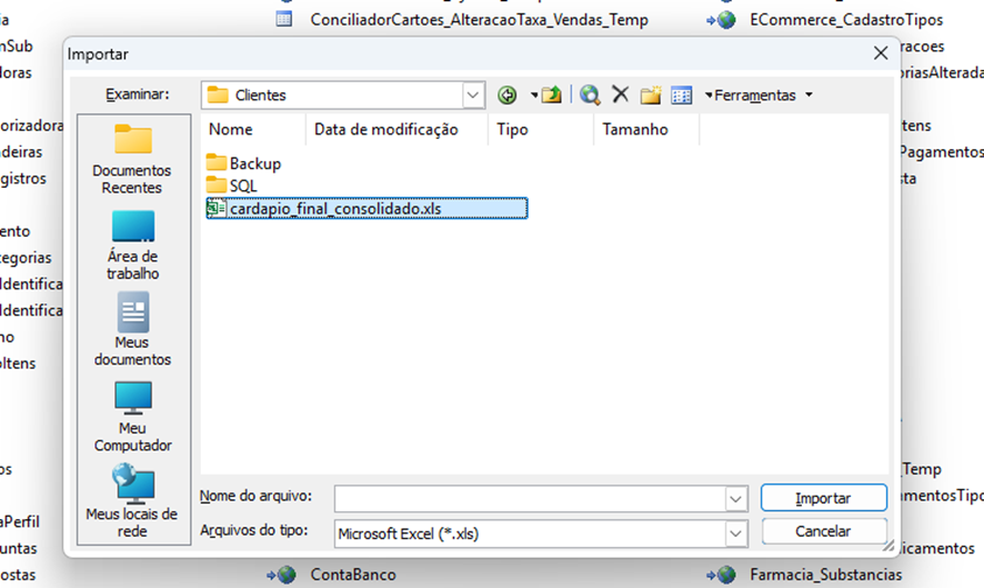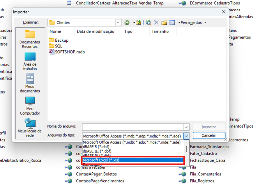 - A janela de importação será exibida.**** No campo " Arquivos do tipo", selecione a opção "Microsoft Excel (*.xls)" para importar a planilha convertida.