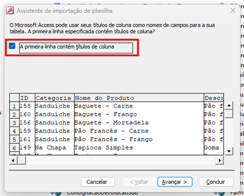 - Você será direcionado para a tela do Assistente de Importação. Marque a opção que indica que a primeira linha da planilha contém os títulos das colunas. Em seguida, clique em "Avançar" para prosseguir.