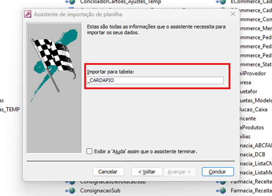 - Renomeie a planilha importada para "_CARDAPIO" e clique em "Concluir". Certifique-se de que a planilha seja importada exatamente com esse nome, sem acentos ou caracteres especiais, para garantir a compatibilidade com o sistema.