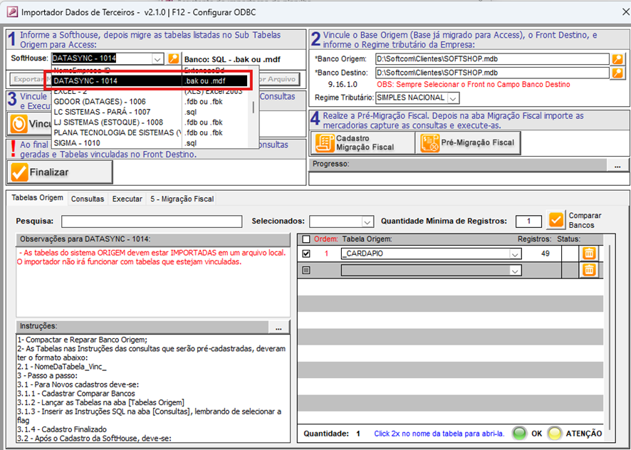 - De volta ao Importador, inicie o processo de cadastro do cardápio. O primeiro passo é selecionar a SOFTHOUSE que será importada. Nesse caso, escolha a opção "DATASYNC", conforme indicado na imagem de referência.