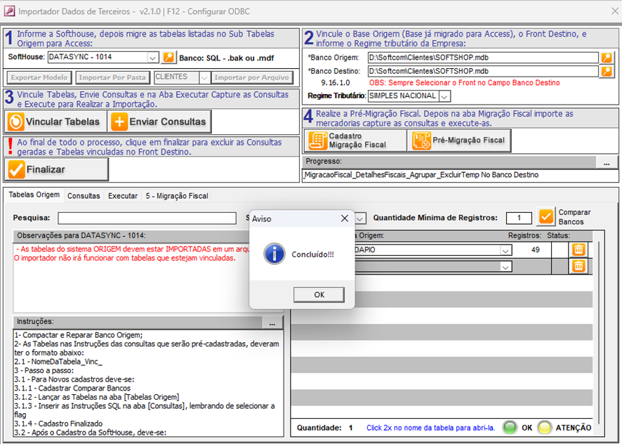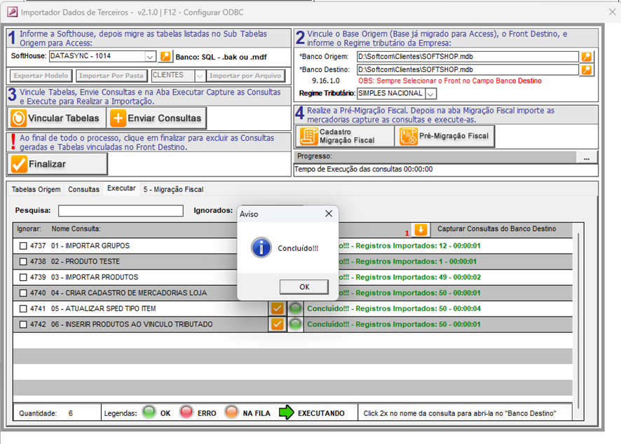 - Aguarde até que a mensagem de confirmação indique que a planilha foi importada para o arquivo "Softshop.mdb". Em seguida, feche o programa e retorne ao Importador.