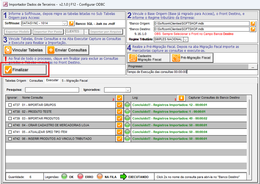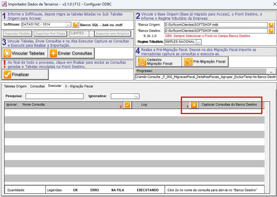 - Clique na seta indicativa do botão "Capturar Consultas do Banco Destino" e aguarde até que todas as consultas sejam listadas.