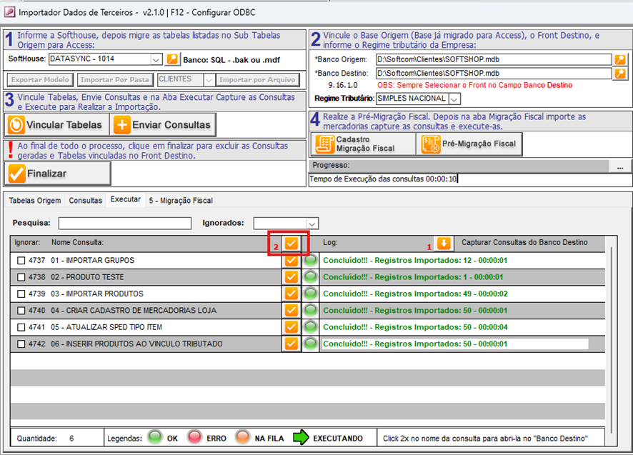 - Marque a opção "Executar Consultas" conforme indicado na imagem. Aguarde até que todas as consultas sejam processadas e executadas corretamente.