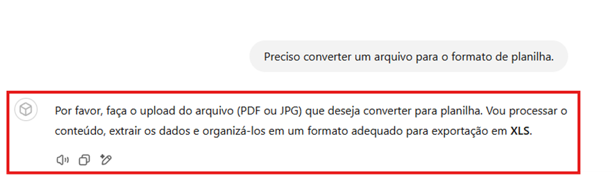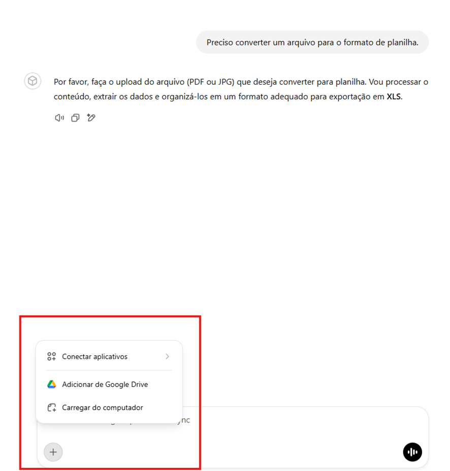 - Uma mensagem será exibida solicitando o envio do arquivo para conversão. Basta anexar o documento conforme as instruções apresentadas na tela.