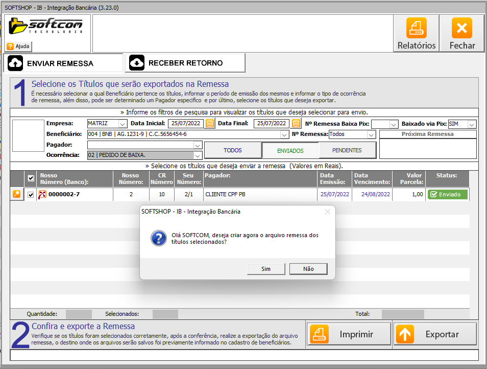 1.3. Status da Remessa deve está gerada ou seja, o cliente já gerou a remessa de entrada de títulos para o seu banco.