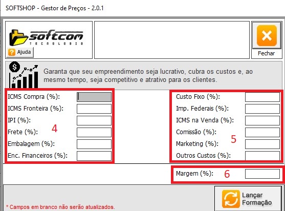 ao preencher os impostos do custo de compra (4), o custo e saída (5) e a margem (6) cliquem em