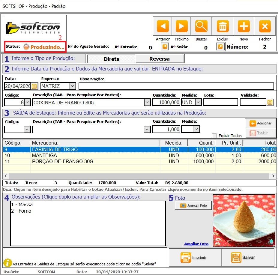 8 - Na imagem abaixo veja uma produção Direta, ela ainda está em processo de produção (2), ou seja ainda não foi salva.