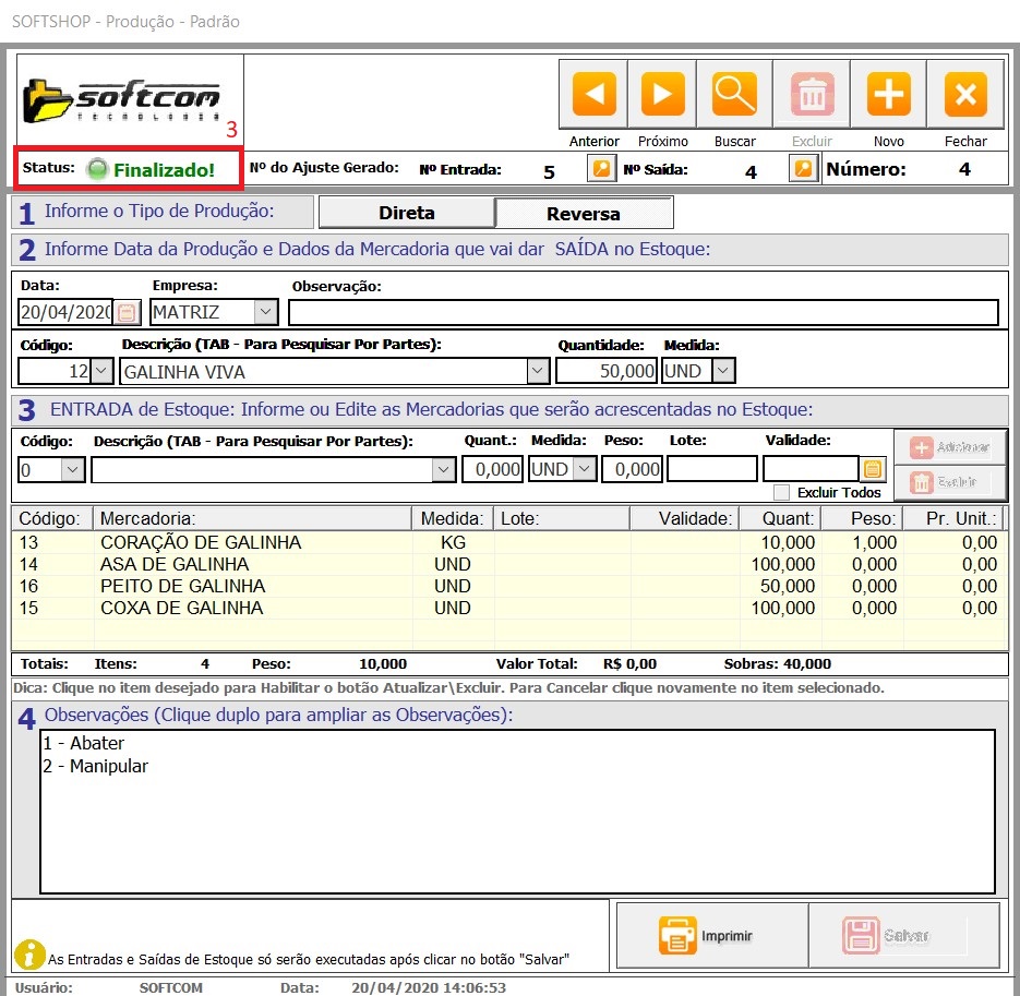 9 - Na imagem abaixo veja uma produção Reversa, já finalizada (3), ou seja foi salva e movimentou o estoque, no caso da Reversa o item da etapa 2 sai do estoque, e do da etapa 3 entra no estoque.