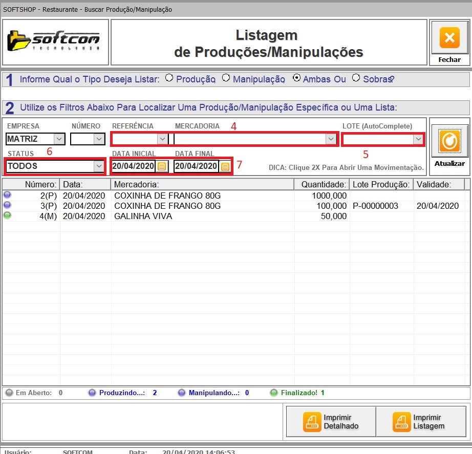 10.1 - Ainda por produto (4), por lote (5), por status (6) e por data (7).