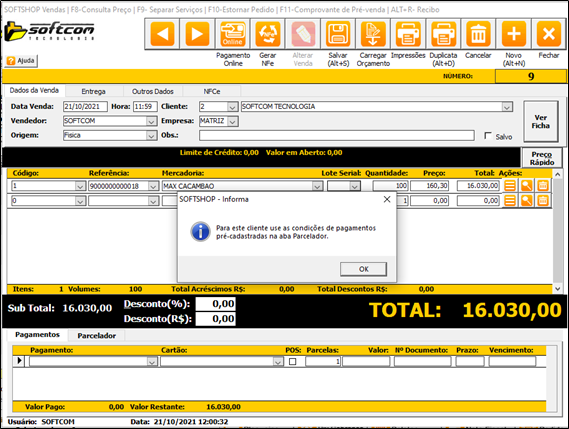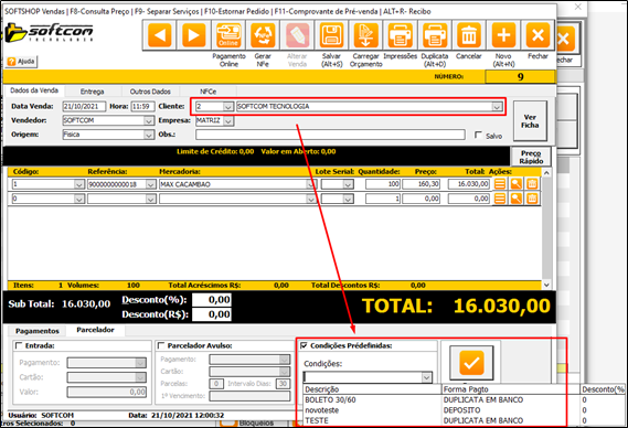 4.Ao definir uma condição de pagamento específica para um cliente, na tela de Vendas só será possível selecionar aquelas condições definidas, pois, o sistema sugerirá automaticamente: