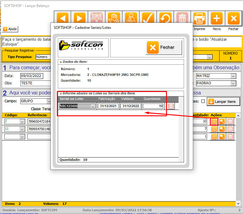 - A listagem de itens será inseridas. Lembre-se de que para produtos da Classe Terapêutica igual a antimicrobiano ou sujeito a controle especial obrigatoriamente será necessário informar os seus respectivos Lotes/serial.