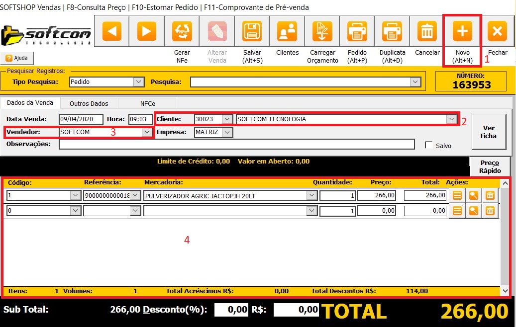 2 - Com a tela aberta cliquem em novo (1), selecione o cliente (2), o vendedor (3) e as mercadorias (4).