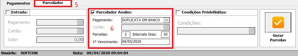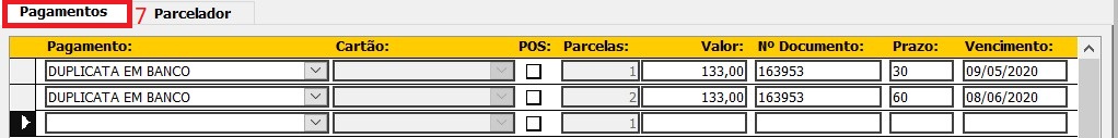 3 - Defina a Forma de pagamento e a(s) parcela(s) na aba parcelador (5) no campo parcelador a vulso (6), neste exemplo, escolhi a forma de pagamento DUPLICATA EM BANCO em 2 parcelas. apos definir clique em