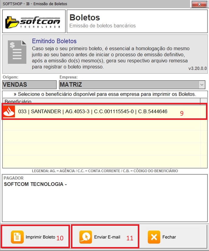 7 - Selecione a conta (9) para imprimir os boletos, e apos isso você pode imprimir (10) ou enviar por e-mail (11).