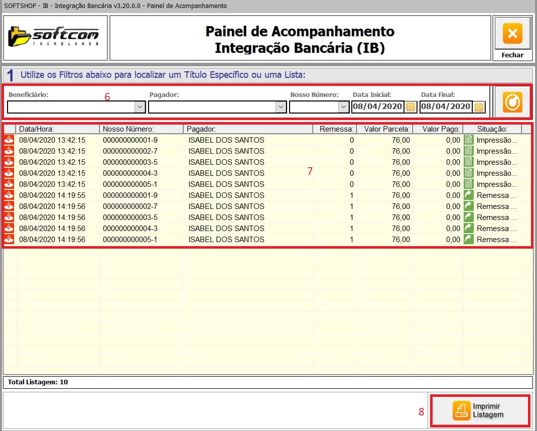 8.1 - Nesta tela você pode executar filtros (6), aplicando os filtros você tem a informação (7) e pode também realizar a impressão (8).