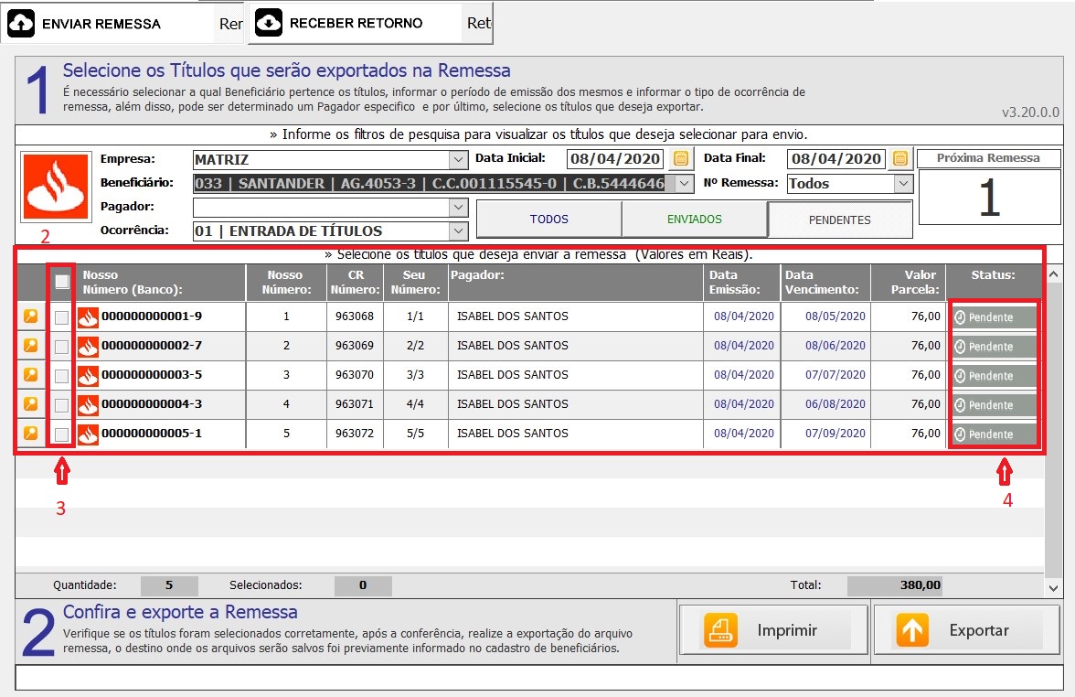 4.7 - Veja em abaixo (2), selecione todos os boletos que deseja gerar remessa (3), na campo status (4) você pode confirmar o status atual do(s) boleto(s).