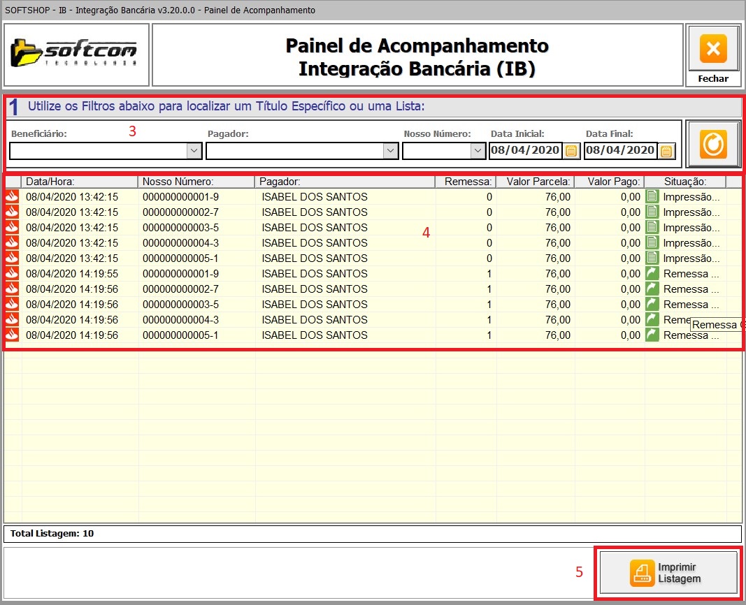 5.1 - Nesta tela você pode executar filtros (3), aplicando os filtros você tem as informações (4) e pode também realizar a impressão(5).
