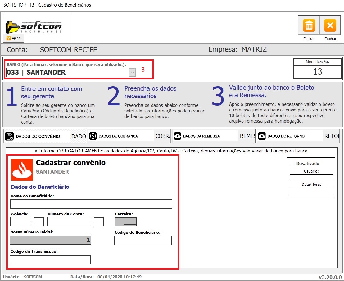 8.7 - Código de transmissão: Informação de controle do Banco Santander veja com o gerente da conta ou suporte do banco no setor de cobrança eletrônica.